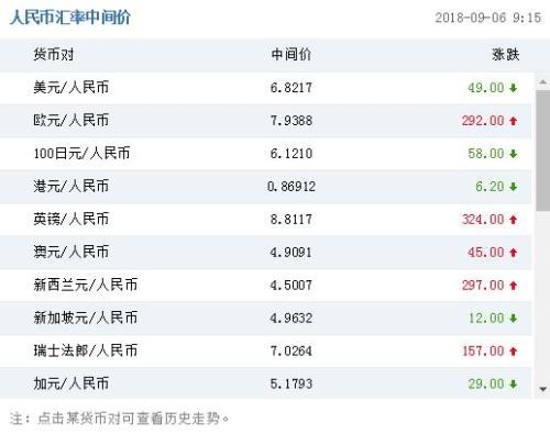 中国人民银行授权中国外汇交易中心公布,2018年9月6日银行间外汇市场人民币汇率中间价为:1美元对人民币6.8217元,1欧元对人民币7.9388元,100日元对人民币6.1210元,1港元对人民币0.86912元,1英镑对人民币8.8117元,1澳大利亚元对人民币4.9091元,1新西兰元对人民币4.5007元,1新加坡元对人民币4.9632元,1瑞士法郎对人民币7.0264元,1加拿大元对人民币5.1793元,人民币1元对0.60745马来西亚林吉特,人民币1元对9.9916俄罗斯卢布,人民币1元对2.2595南非兰特,人民币1元对163.96韩元,人民币1元对0.53845阿联酋迪拉姆,人民币1元对0.54986沙特里亚尔,人民币1元对41.2592匈牙利福林,人民币1元对0.54488波兰兹罗提,人民币1元对0.9391丹麦克朗,人民币1元对1.3266瑞典克朗,人民币1元对1.2309挪威克朗,人民币1元对0.96562土耳其里拉,人民币1元对2.8353墨西哥比索,人民币1元对4.8030泰铢。