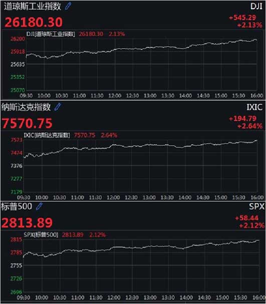 美国三大股指集体收涨 道指涨逾540点纳指飙升2.6%