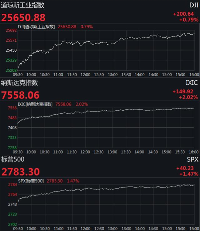 截至收盘,道琼斯工业平均指数收涨200.64点,涨幅0.79%,报25650.88点。纳斯达克综合指数收涨149.92点,涨幅2.02%,报7558.06点。标普500指数收涨40.23点,涨幅1.47%,报2783.30点。