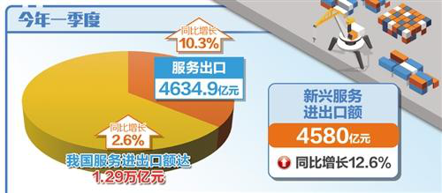 今年以来,我国服务贸易延续了稳中向好的发展态势,一季度服务进出口额达1.29万亿元,同比增长2.6%,其中服务出口实现了4634.9亿元,同比增长10.3%。新兴服务进出口实现4580亿元,同比增长12.6%。