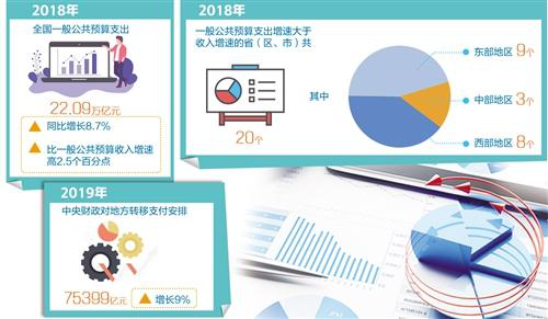2018年全国一般公共预算支出22.09万亿元,同比增长8.7%,比一般公共预算收入增速高2.5个百分点,其中教育、医疗卫生、社会保障、节能环保、城乡社区等与民生相关的财政支出保持较高增速,有力推动了我国社会事业的发展,增加了人民群众的获得感和幸福感。