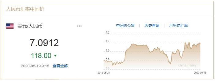 中新经纬客户端5月19日电 中国外汇交易中心数据显示,5月19日,人民币兑美元中间价调升118个基点,报7.0912。前一交易日人民币兑美元中间价报7.1030。