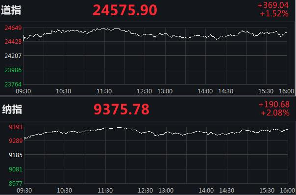 截至收盘,道琼斯工业指数涨369.04点,涨幅1.52%,报24575.90点;纳斯达克指数涨190.68点,涨幅2.08%,报9375.78点;标普500指数涨48.67点,涨幅1.67%,报2971.61点。