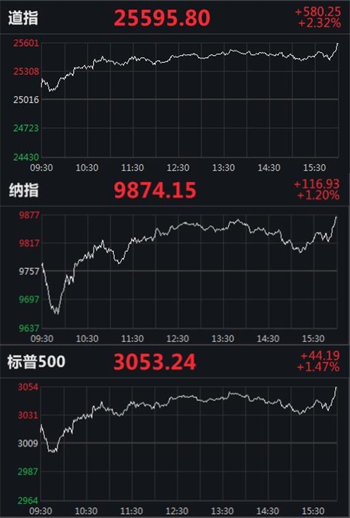 截至收盘,道指涨580.25点,涨幅2.32%,报25595.80点;纳指涨116.93点,涨幅1.20%,报9874.15点;标普500指数涨44.19点,涨幅1.47%,报3053.24点。