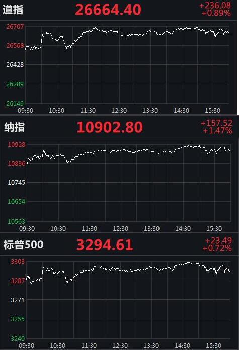 截至收盘,道指涨236.08点,涨幅0.89%,报26664.40点;纳指涨157.52点,涨幅1.47%,报10902.80点;标普500指数涨23.49点,涨幅0.72%,报3294.61点。
