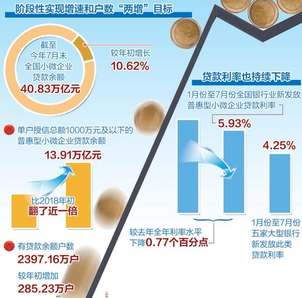 数据显示,今年以来小微企业信贷投放呈高速增长态势。截至今年7月末,全国小微企业贷款余额40.83万亿元,较年初增长10.62%。其中,单户授信总额1000万元及以下的普惠型小微企业贷款余额13.91万亿元,与2018年初相比,翻了将近一倍。同时,有贷款余额户数2397.16万户,较年初增加285.23万户,阶段性实现增速和户数“两增”目标。