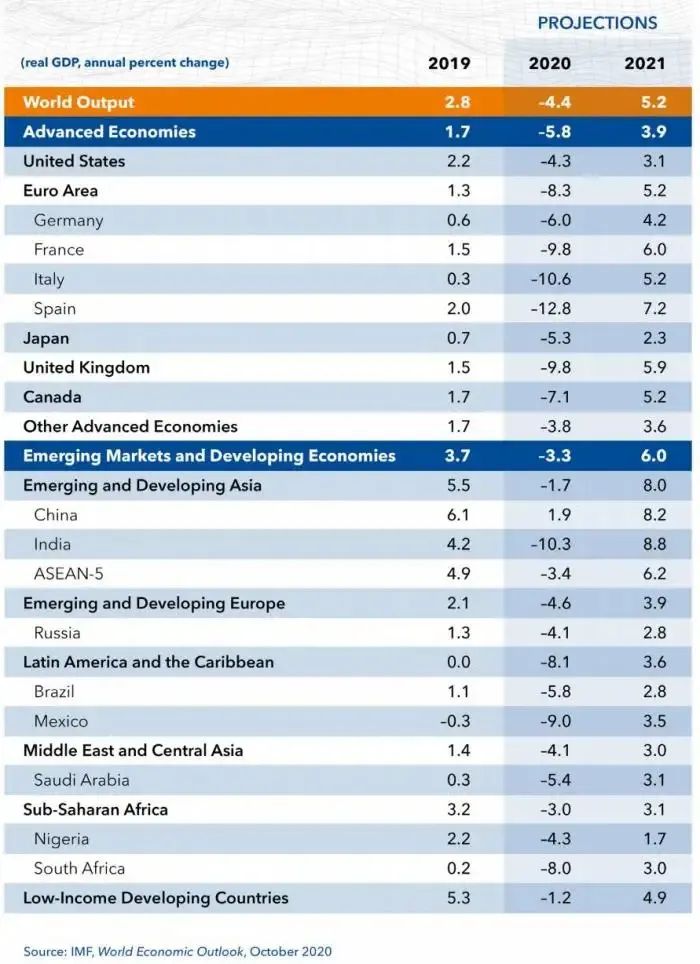 IMF预测,2020年发达经济体GDP将萎缩5.8%。其中,美国经济将萎缩5.8%,日本经济将萎缩5.3%,英国经济将萎缩9.8%,欧元区经济将萎缩8.3%,欧元区中的德国、法国、意大利、西班牙经济将分别萎缩6.0%、9.8%、10.6%、12.8%。2020年新兴市场和发展中经济体GDP将萎缩3.3%。其中,印度经济将萎缩10.3%,俄罗斯经济将萎缩4.1%,巴西经济将萎缩5.8%,南非经济将萎缩8.0%。2020年中国经济将增长1.9%,相较6月份预测上调了0.9个百分点,2021年中国经济增长将大幅反弹至8.2%。