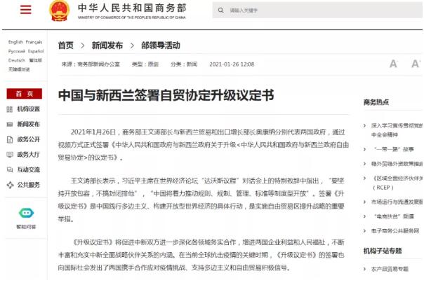 1月26日,商务部部长王文涛与新西兰贸易和出口增长部长奥康纳分别代表两国政府,通过视频方式正式签署《中华人民共和国政府与新西兰政府关于升级<中华人民共和国政府与新西兰政府自由贸易协定>的议定书》(以下简称《升级议定书》)。