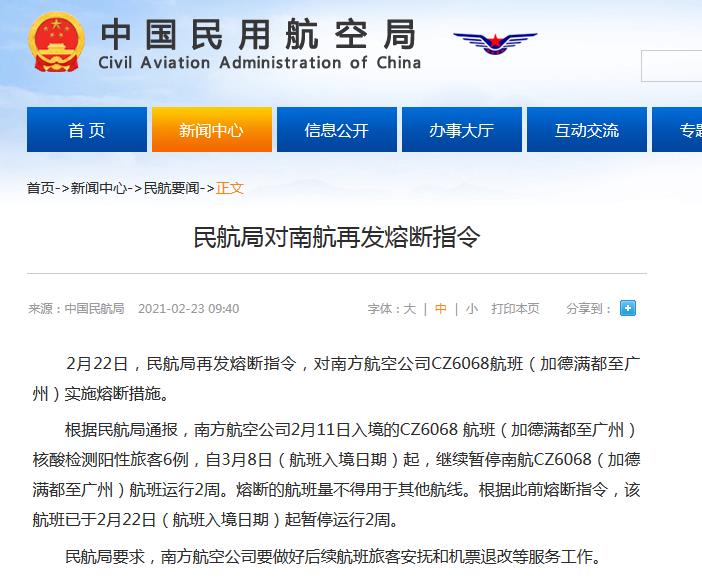 据民航局网站消息,2月22日,民航局再发熔断指令,对南方航空公司CZ6068航班(加德满都至广州)实施熔断措施。
