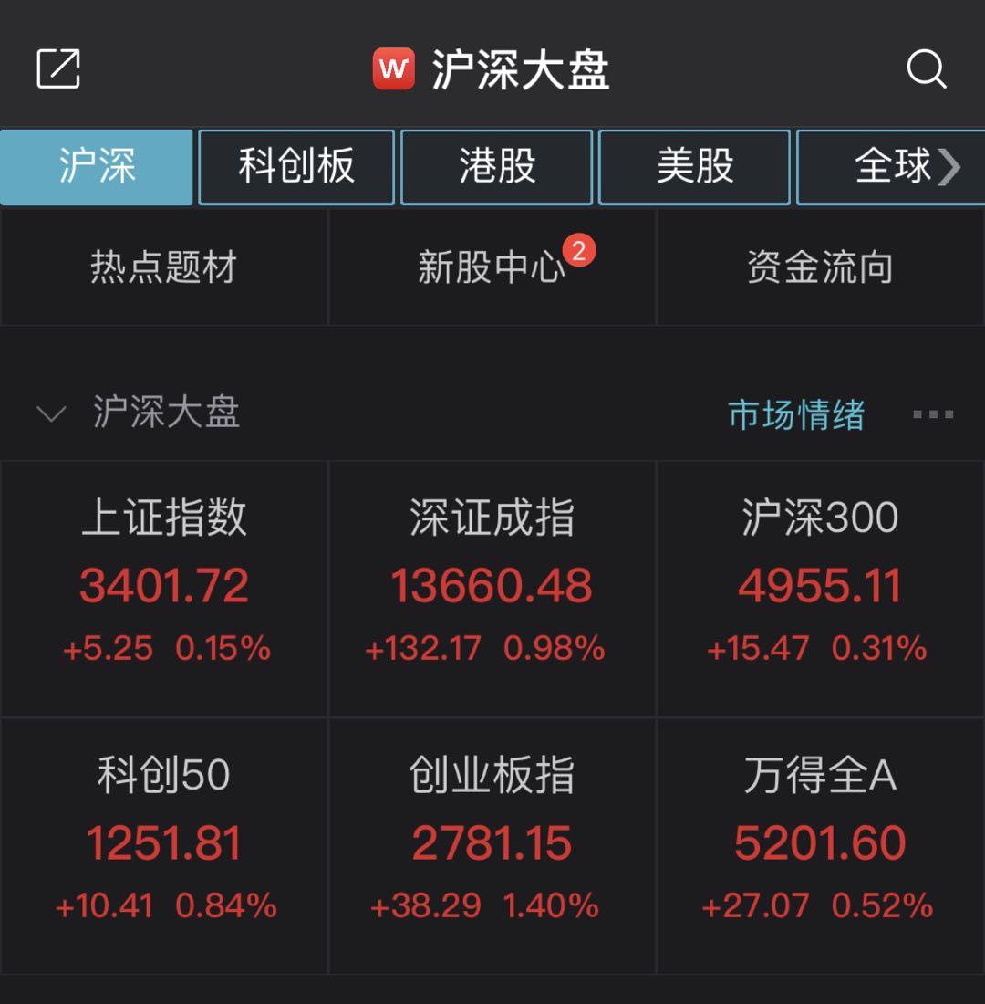 截至午间收盘,沪指报3401.72点,涨幅0.15%,成交额1596.8亿元;深成指报13660.48点,涨幅0.98%,成交额2355.86亿元;创业板指报2781.15点,涨幅1.4%。