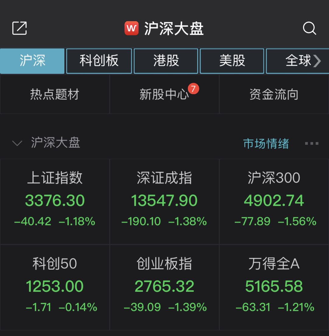 截至午间收盘,沪指报3376.30点,跌幅1.18%,成交额1667.45亿元;深成指报13547.90点,跌幅1.38%,成交额2474.48亿元;创业板指报2765.32点,跌幅1.39%。