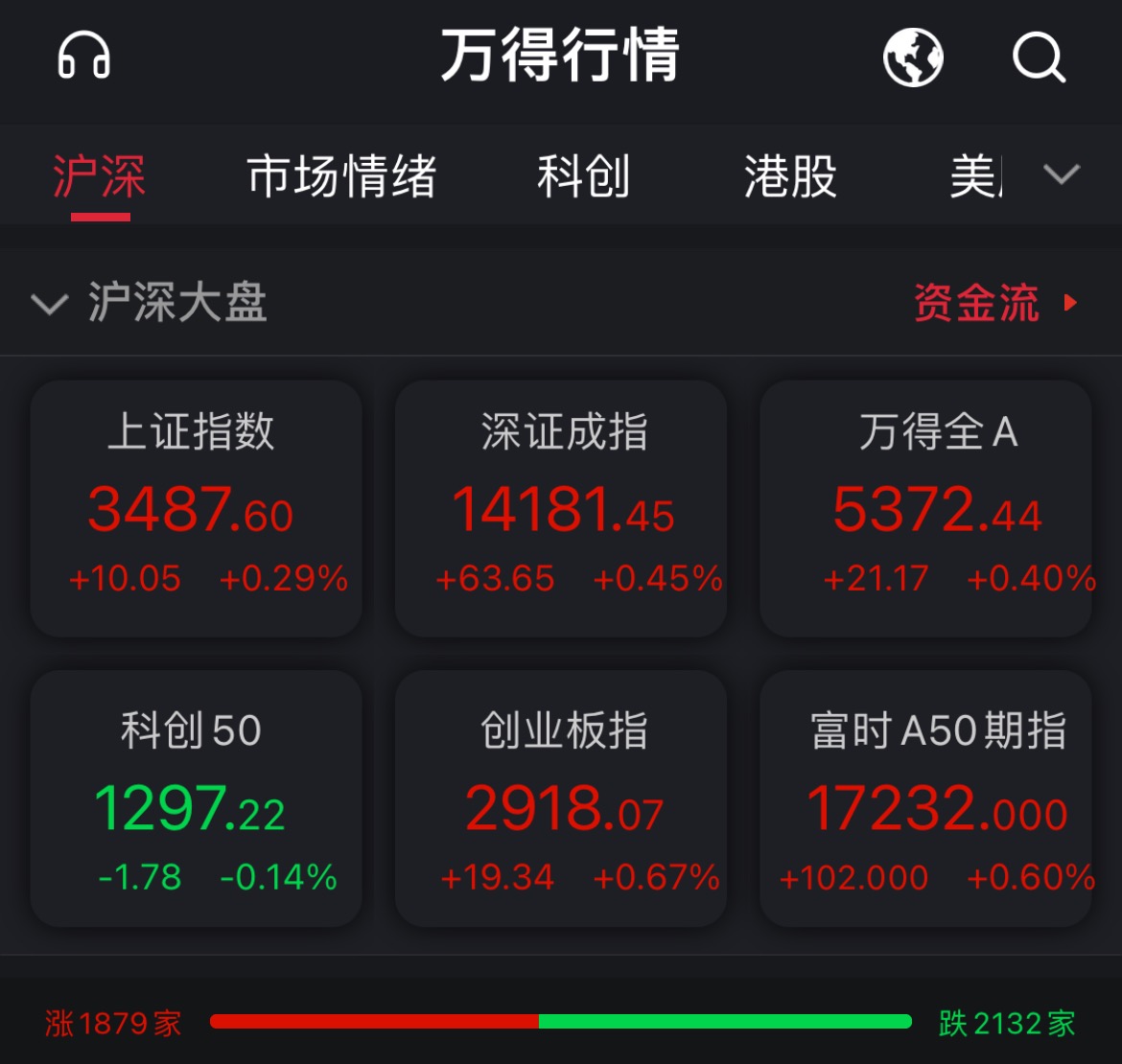 截至午间收盘,沪指报3487.60点,涨幅0.29%,成交额2186.53亿元;深成指报14181.45点,涨幅0.45%,成交额3025.0亿元;创业板指报2918.07点,涨幅0.67%;上证50指数报3522.32点,涨幅0.25%。