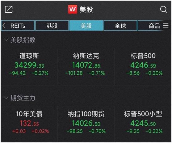 具体来看,截至收盘,道指跌94.42点,跌幅0.27%,报34299.33点;纳指跌101.28点,跌幅0.71%,报14072.86点;标普500指数跌8.56点,跌幅0.20%,报4246.59点。
