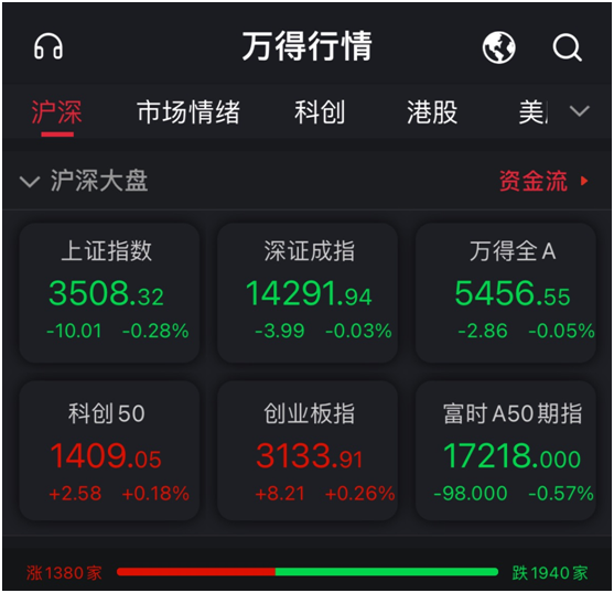 沪指低开3508.32点,跌幅0.28%,成交额28.99亿元;深成指报14291.94点,跌幅0.03%,成交额35.27亿元;创业板指报3133.91点,涨幅0.26%;上证50指数3477.47点,跌幅0.25%;沪深300报5074.38点,跌幅0.12%。