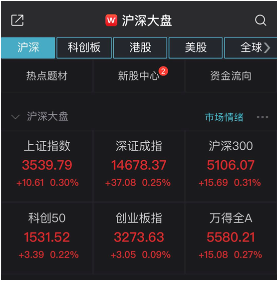 沪指高开3539.79点,涨幅0.3%,成交额33.59亿元;深成指报14678.37点,涨幅0.25%,成交额44.59亿元;创业板指报3273.63点,涨幅0.09%;上证50指数3444.75点,涨幅0.39%;沪深300报5106.07点,涨幅0.31%。