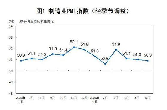 据国家统计局网站消息,国家统计局服务业调查中心和中国物流与采购联合会30日联合发布6月中国采购经理指数运行情况。数据显示,6月份,中国制造业采购经理指数(PMI)为50.9%,较上月微落0.1个百分点,继续位于临界点以上,制造业延续稳定扩张态势。