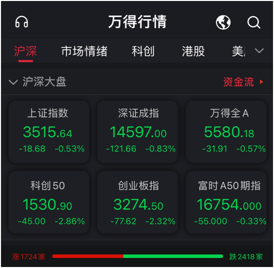 截至午间收盘,沪指报3515.64点,跌幅0.53%,成交额3176.44亿元;深成指报14597.00点,跌幅0.83%,成交额4056.18亿元;创业板指报3274.50点,跌幅2.32%;上证50指数报3384.45点,跌幅0.6%。