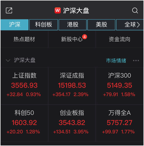 截至午间收盘,沪指报3556.93点,涨幅0.93%,成交额3645.31亿元;深成指报15198.53点,涨幅2.39%,成交额4863.38亿元;创业板指报3543.82点,涨幅3.95%。