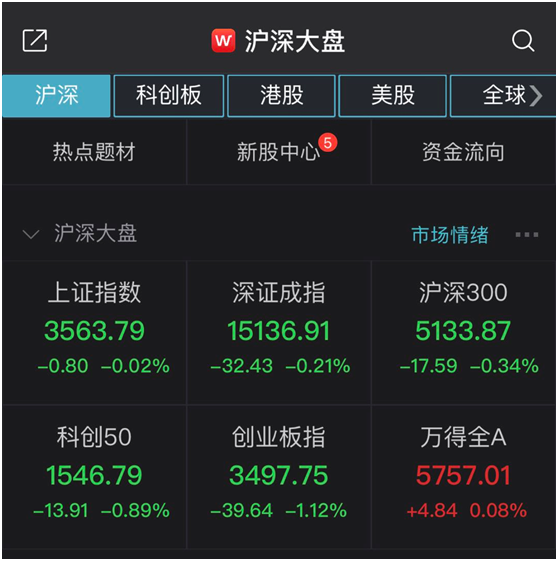 截至午间收盘,沪指报3563.79点,跌幅0.02%,成交额3172.21亿元;深成指报15136.91点,跌幅0.21%,成交额4023.97亿元;创业板指报3497.75点,跌幅1.12%。