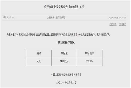 据央行网站消息,为维护银行体系流动性合理充裕,2021年7月19日人民银行以利率招标方式开展了100亿元逆回购操作。具体情况如图。