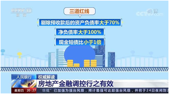 在房地产行业高杠杆、高负债的背景下,为增强房地产企业融资的市场化、规则化、透明度,央行、住建部自去年8月出台了重点房地产企业资金监测和融资管理的 “三线四档”规则。三道红线是指剔除预收款后的资产负债率大于70%、净负债率大于100%、现金短债比小于1倍。按照踩线情况,房地产企业被分为“红、橙、黄、绿”四档,“红档”企业有息负债规模不能高于现有水平,“橙档”企业有息负债年增速不得超过5%,“黄档”企业不得超过10%,“绿档”企业不得超过15%。