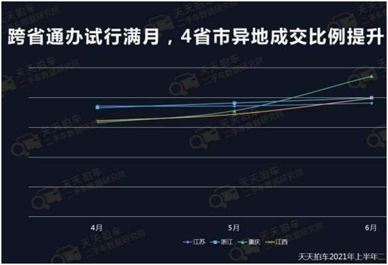 中国二手车在线拍卖平台天天拍车大数据研究院方面28日发布的《2021年上半年二手车跨区域流通报告》显示,在“跨省通办”推行利好下,江苏、浙江、重庆、江西的异地成交数量在6月有了明显提升。同时,异地成交的新能源二手车车龄以3年以内为最多。