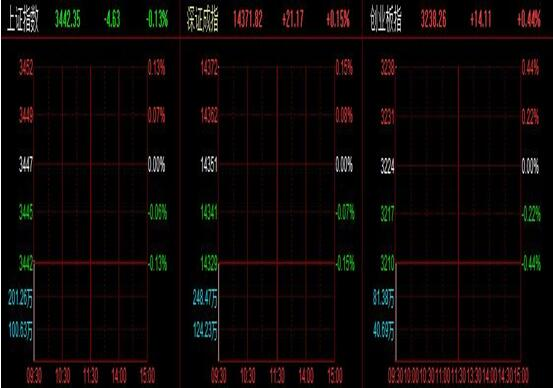 上证指数跌0.13%,报3442.35点,深证成指涨0.15%,报14371.82点,创业板指涨0.44%,报3238.26点,高送转、钠离子电池、青蒿素等板块领涨两市,无人零售、氢能源、代糖概念等板块跌幅居前。