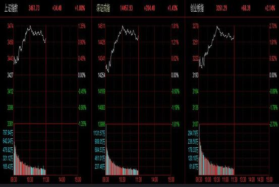 截至午盘,上证指数涨1%,报3461.73点,深证成指涨1.43%,报14457.93点,创业板指涨2.14%,报3261.29点。