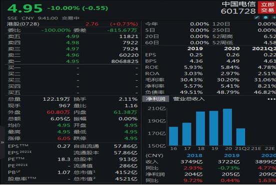 8月23日,中国电信A股开盘跌停。截至收盘,跌停板封单高达1003万手,想要出逃的资金规模超过55亿元。截至当日收盘,该股报6.11元上涨34.88%,换手率达67.14%,全日成交201.1亿元,位居A股成交额之首。