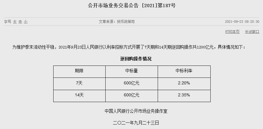 据央行网站消息,为维护季末流动性平稳,2021年9月23日央行以利率招标方式开展了7天期和14天期逆回购操作共1200亿元,中标利率分别为2.20%和2.35%。Wind数据显示,今日100亿元逆回购到期,因此单日净投放1100亿元。