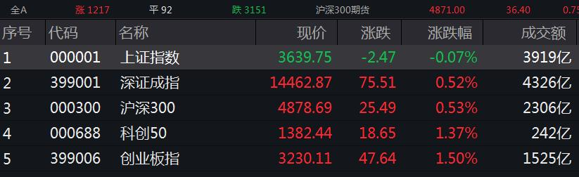 截至9月24日午间收盘,三大指数收盘涨跌不一。上证指数跌0.07%,报3639.75点。深证成指涨0.52%,报14462.87点。创业板指涨1.50%,报3230.11点。