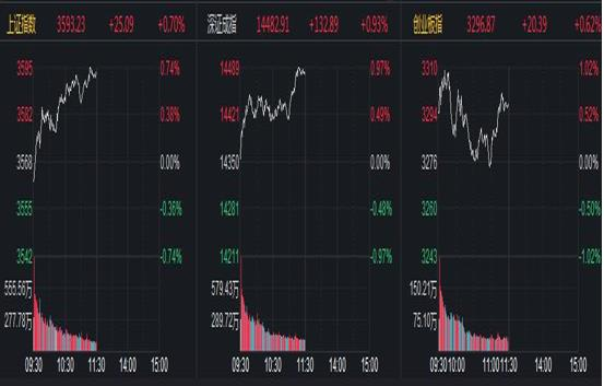 上证指数涨0.70%,报3593.23点。深证成指涨0.93%,报14482.91点。创业板指涨0.62%,报3296.87点。