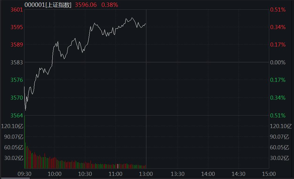 截至午间收盘,沪指涨0.38%,报3596.06点;深成指涨0.38%,报14547.46点;创业板指涨1.53%,报3335.30点。
