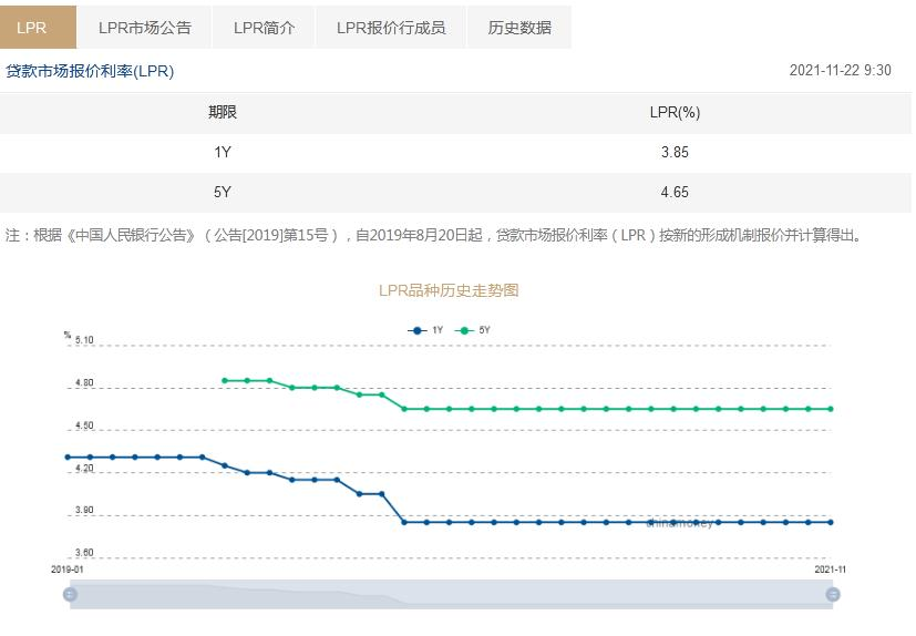 据中国外汇交易中心网站22日消息,中国人民银行授权全国银行间同业拆借中心公布,2021年11月22日贷款市场报价利率(LPR)为:1年期LPR为3.85%,5年期以上LPR为4.65%。以上LPR在下一次发布LPR之前有效。至此,LPR已连续19个月“原地踏步”。