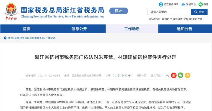 日前,杭州市税务局稽查局已依法向朱宸慧、林珊珊下达税务行政处理决定书,并依法履行税务行政处罚告知程序。