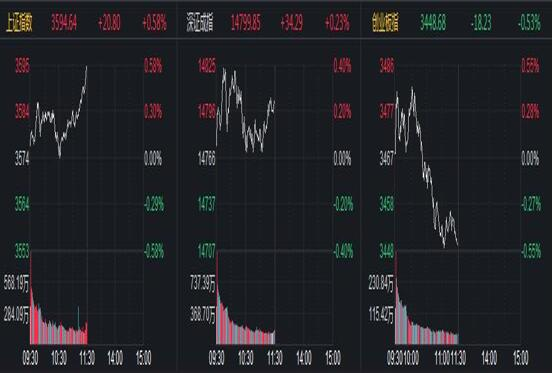 上证指数涨0.58%,报3594.64点。深证成指涨0.23%,报14799.85点。创业板指跌0.53%,报3448.68点。