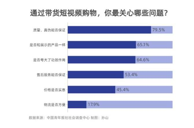 数据显示,通过带货短视频购物,79.5%的受访者最关心质量、真伪能否保证,65.1%的受访者最关心是否和展示的产品一样,64.6%的受访者最关心是否夸大了功效作用。其他方面还有:售后服务能否保证(53.4%)、价格是否实惠(45.4%)和物流是否方便(17.9%)等。