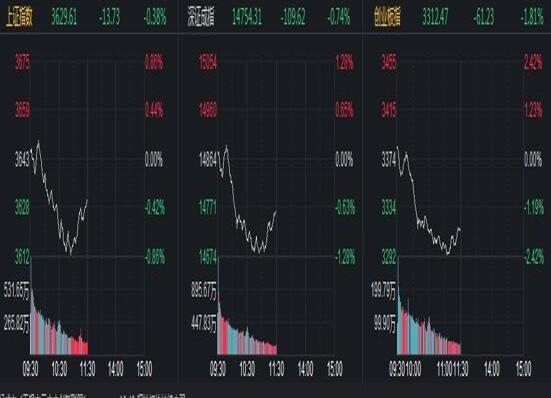 上证指数跌0.38%,报3629.61点。深证成指跌0.74%,报14754.31点。创业板指跌1.81%,报3312.47点。