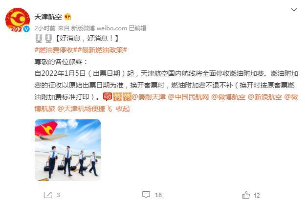 天津航空发布消息显示,自2022年1月5日(出票日期)起,天津航空国内航线将全面停收燃油附加费。燃油附加费的征收以原始出票日期为准,换开客票时,燃油附加费不退不补(换开时按原客票燃油附加费标准打印)。