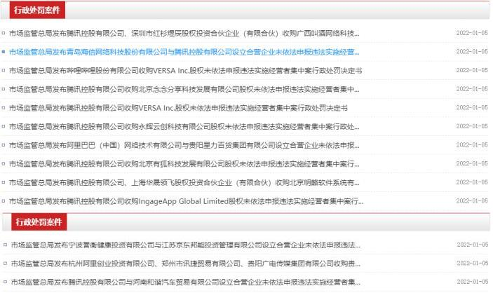 市场监管总局公布13起反垄断处罚案,涉及腾讯阿里B站等