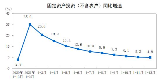 1月17日,国家统计局发布2021年中国经济数据。2021年1-12月份,全国固定资产投资(不含农户)544547亿元,比上年增长4.9%;比2019年1-12月份增长8.0%,两年平均增长3.9%。其中,民间固定资产投资307659亿元,比上年增长7.0%。从环比看,12月份固定资产投资(不含农户)增长0.22%。
