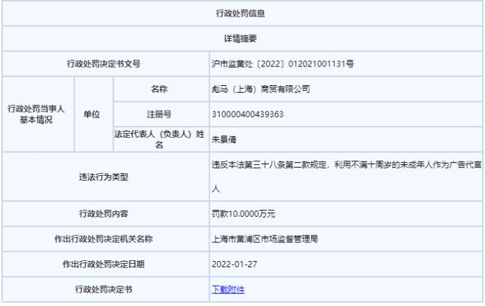 值得一提的是,2020年7月,彪马(上海)商贸有限公司就曾因利用不满十周岁的未成年人作为广告代言人被上海市普陀区市场监督管理局罚款24万元。