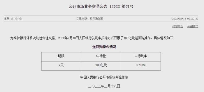 据中国人民银行官网消息,为维护银行体系流动性合理充裕,2022年2月18日人民银行以利率招标方式开展了100亿元逆回购操作,期限为7天,中标利率2.10%。