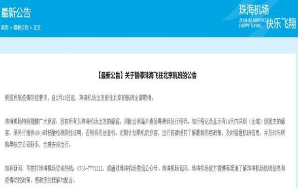 据珠海机场通报,根据民航疫情防控要求,自2月18日起,珠海机场出发前往北京的航班全部取消。