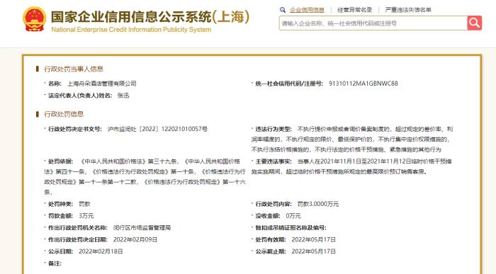 国家企业信用信息公示系统(上海)官网显示,近日,上海舟朵酒店管理有限公司因违反价格法被闵行区市场监督管理局罚款3万元。