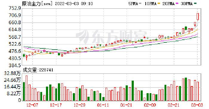 3月3日,上海原油期货主力合约开盘后不久即触涨停,现报719.9元/桶,涨幅10.99%,继3月2日之后,连创上市以来新高。