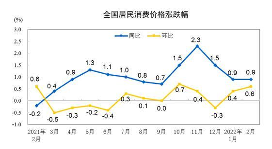 据国家统计局网站,2022年2月份居民消费价格同比上涨0.9%,环比上涨0.6%。国家统计局城市司高级统计师董莉娟表示,2月份,受春节因素和国际能源价格波动等共同影响,CPI环比涨幅略有扩大,同比涨幅总体平稳。
