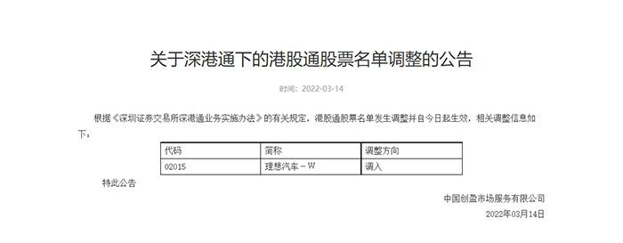 14日,深交所早间发布公告,将理想汽车-W调入港股通股票名单,并于今日起正式生效。