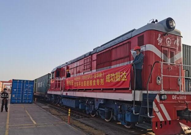 15日,一列载有1274吨哈萨克斯坦大麦的“义新欧”返程班列驶入位于浙江省金华市金东区的铁路金华南站,这是该省首趟来自“一带一路”国家和地区的进口粮食国际班列。