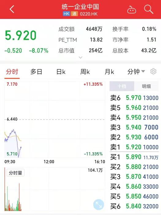 16日,港股统一企业中国盘中股价迅速跳水,一度跌超11%,截至发稿时,仍跌逾8%报5.92港元/股。确认插旗菜业为供应商的康师傅控股现亦跌超10%。